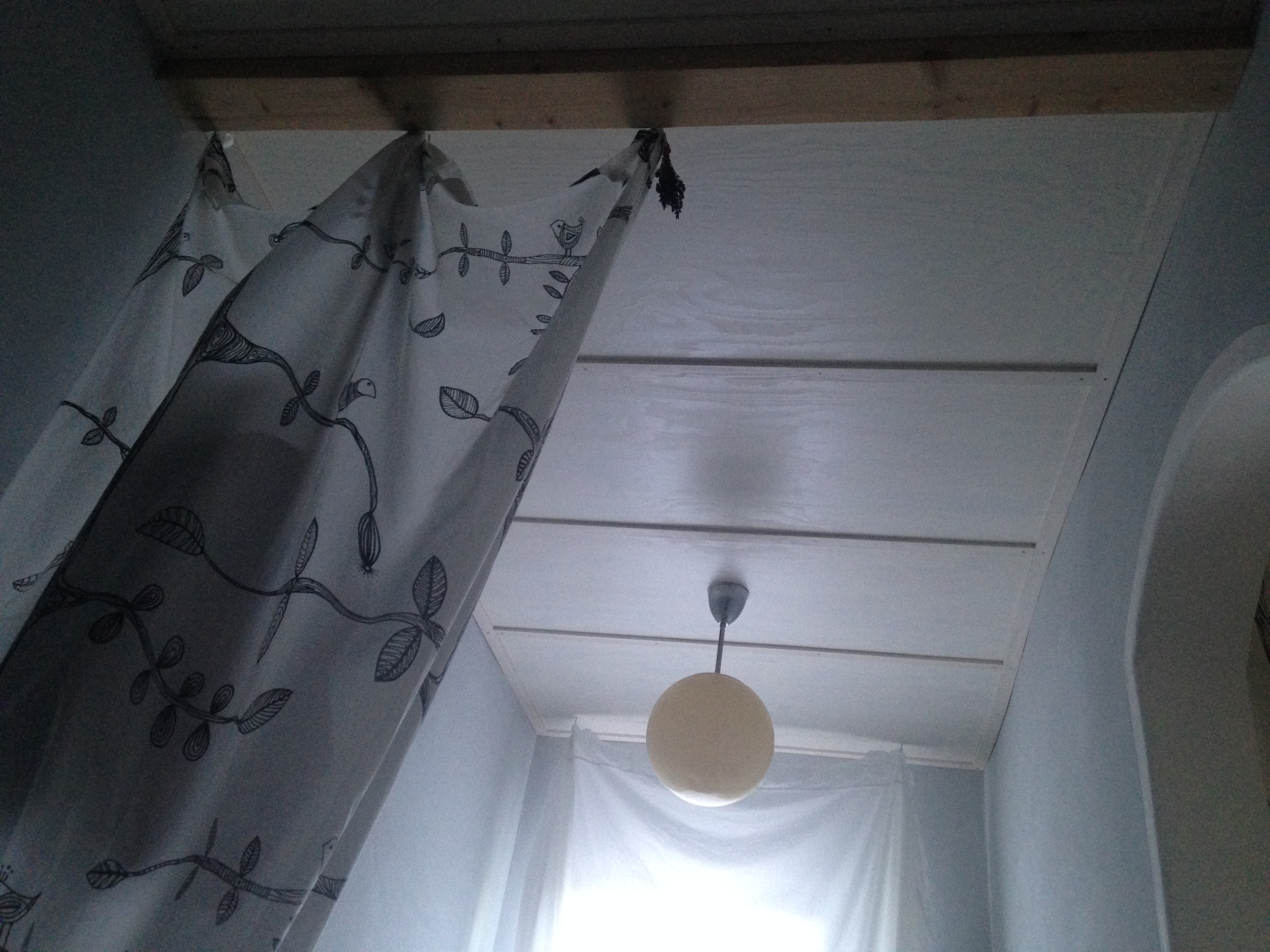 Im Schlafzimmer wird die alte runde Deckenleuchte aus blassgelbem Milchglas am Abend durch einen Dimmer zum „MOND“ – besonders von Kindern heiß geliebt! Die Decke wurde mit weiß lasierten Seekiefer-Sperrholzplatten verkleidet und unterstützt das nordisch-frische Flair, gerade im Hochsommer eine schöne athmosphärische Abkühlung.