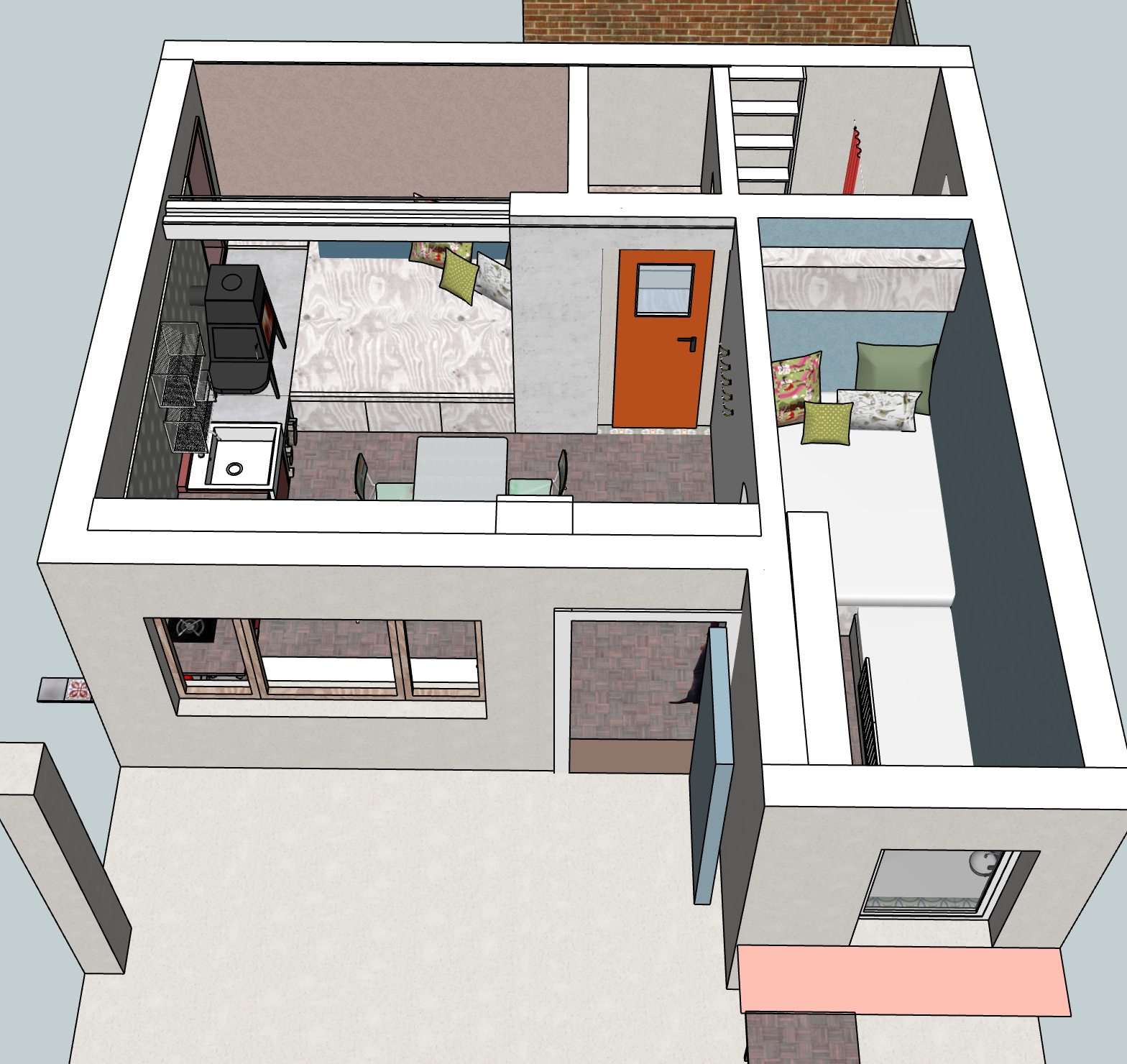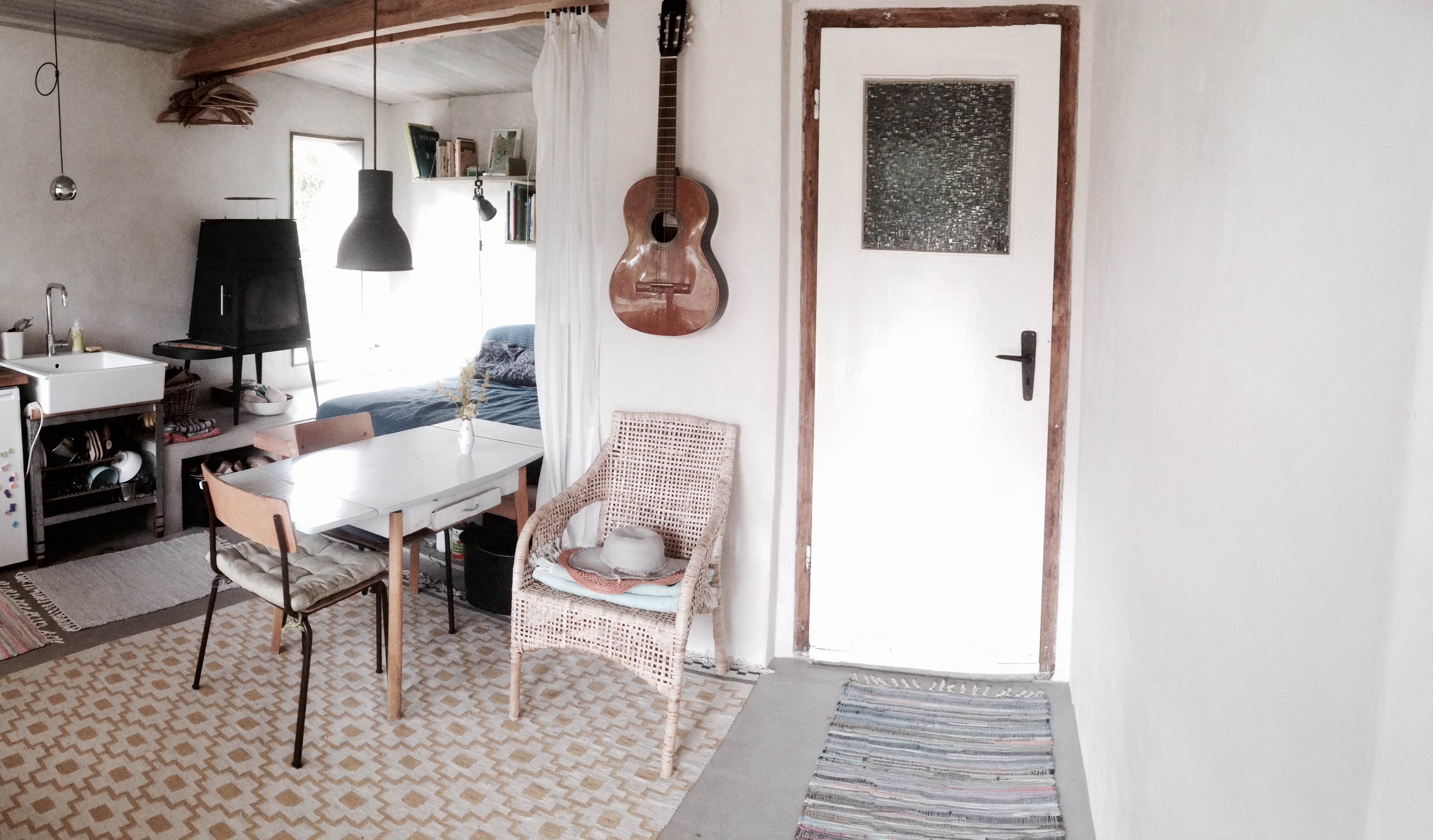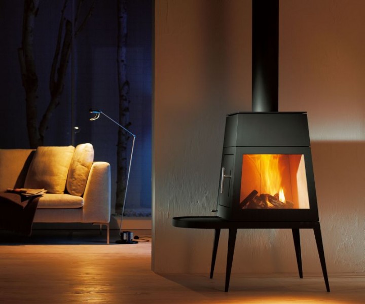 Das Herzstück ist der skandinavische Kamin – der sinnvollste Ofen für kleine Räume der mir bisher begegnet ist: Der Heizraum mit fester Glas-Scheibe befindet sich auf einer Art „Ofenbank“ mit zierlichen Füßen, die Tür zum beheizen ist seitlich darüber angebracht. Kein Dreck auf dem Fußboden, kein heißer Sockel!