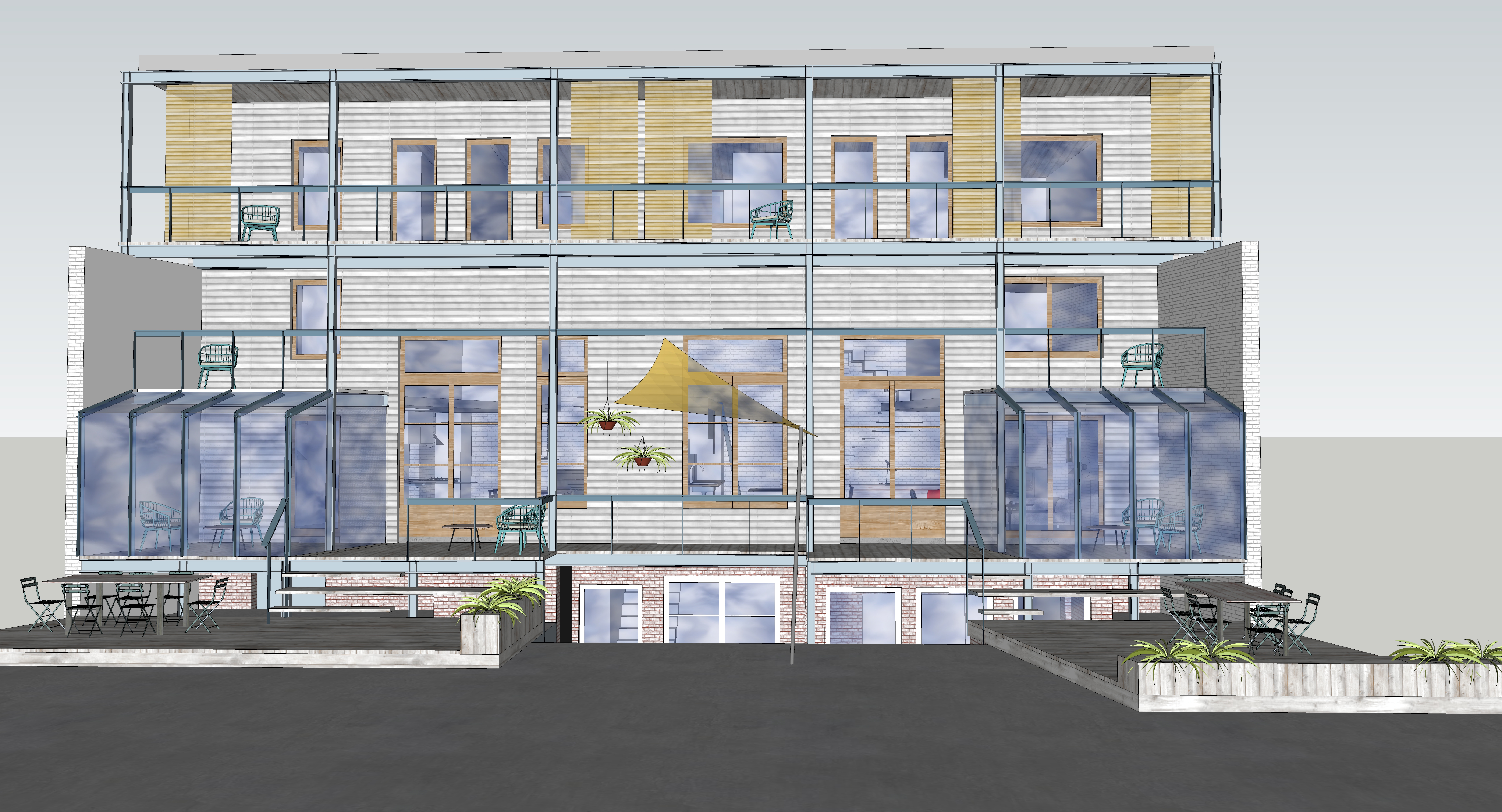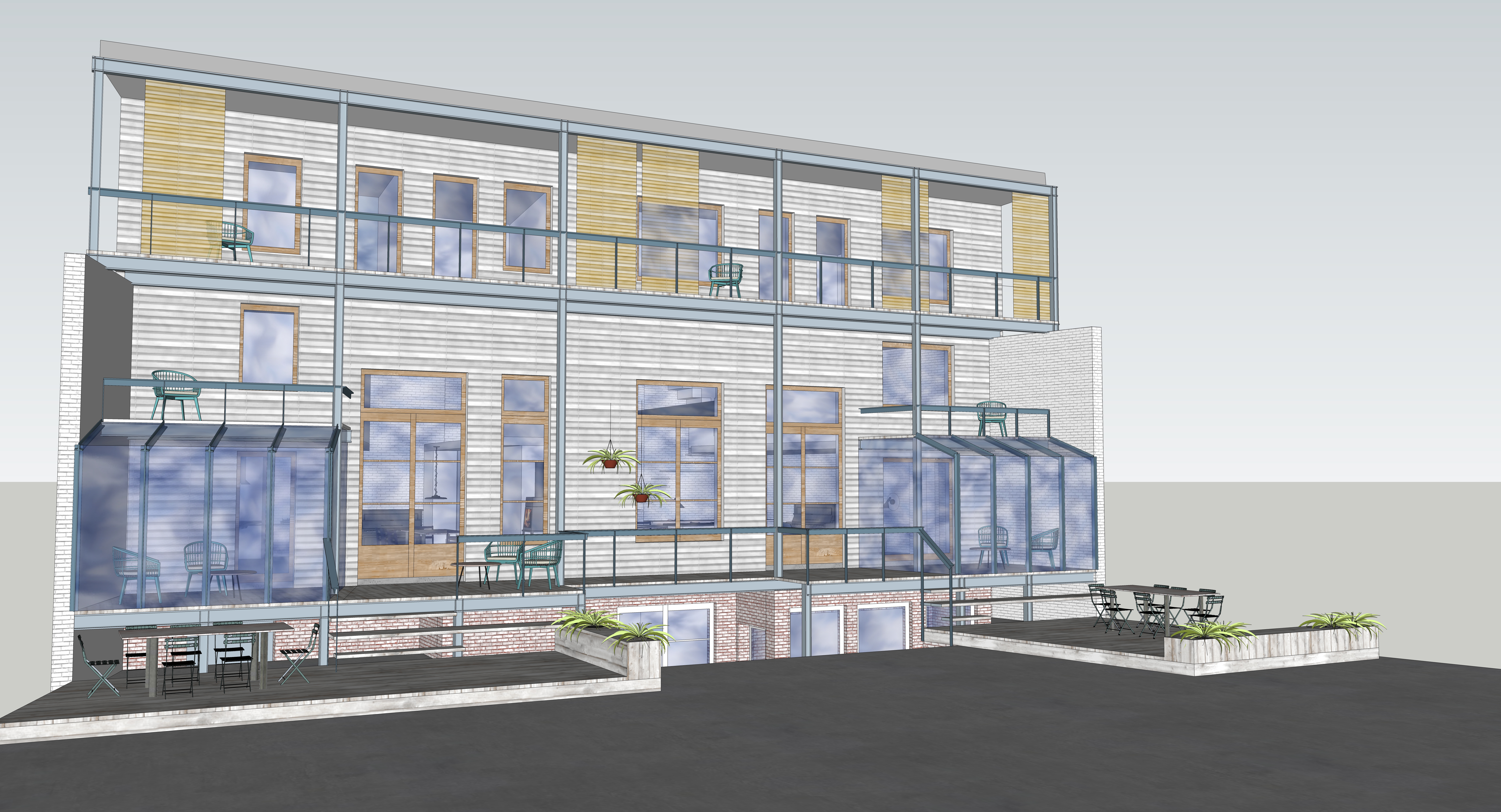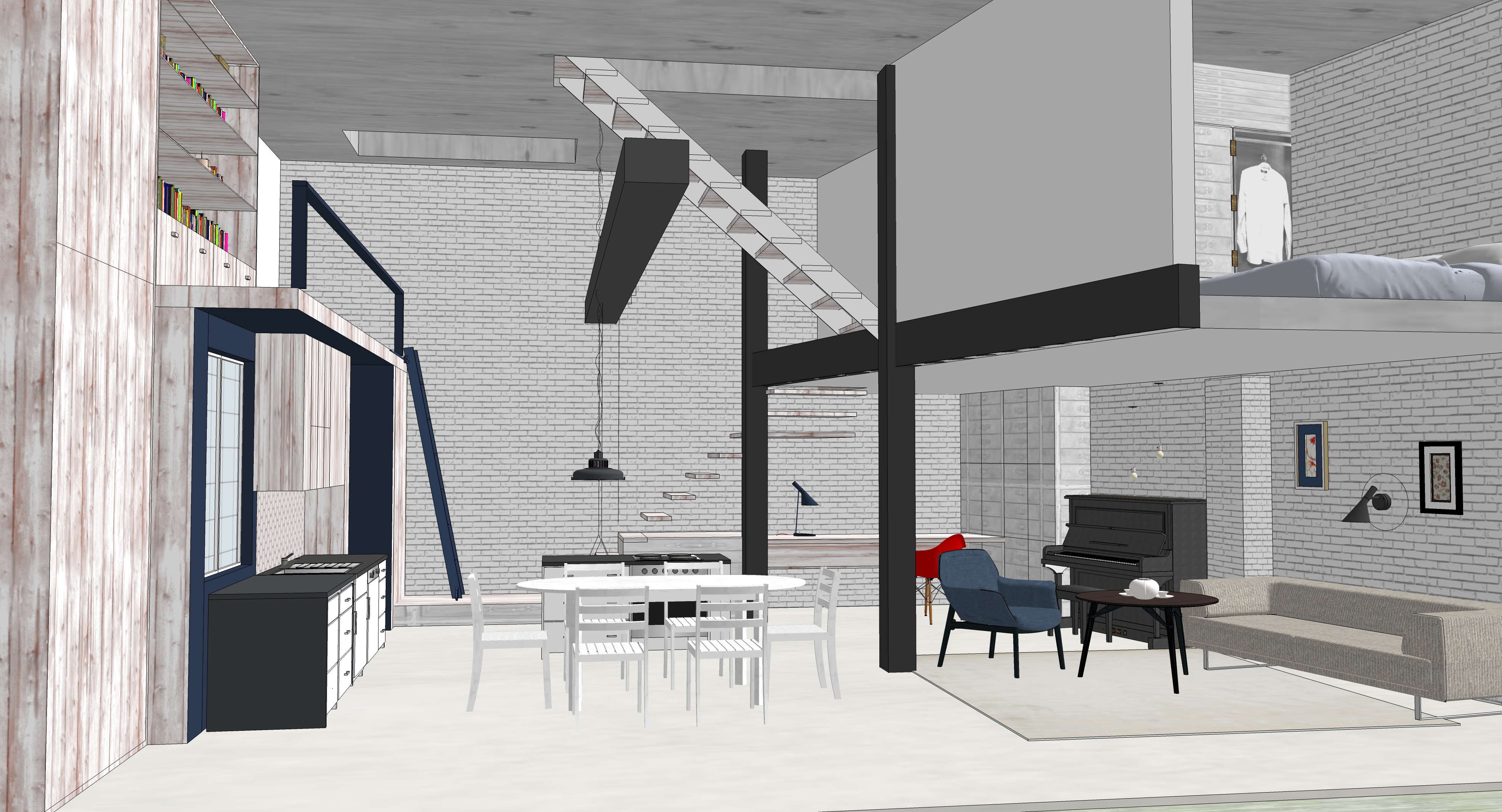 Der Bestand ist ein extrem verbauter 1-geschossiger einfacher Ziegelbau, dessen Grundsubstanz erst einmal freigeschält werden musste. Da die Grundfläche für die einzelnen Familien begrenzt ist, entschieden sich die Bauherren für einen gemeinsamen Zugang vom Hof über das vorhandene Souterrain. Dadurch konnten die Wohnräume zu großzügigen Lofts werden. Eine eingezogene Galerie-Ebene in die fast 5 Meter hohen Räume bietet genügend Raum für Elternschlafzimmer und Bad, eine Treppe führt von dort weiter hoch in das Sattelgeschoss auf dem Dach, wo die jeweils 2 Kinder wohnen.