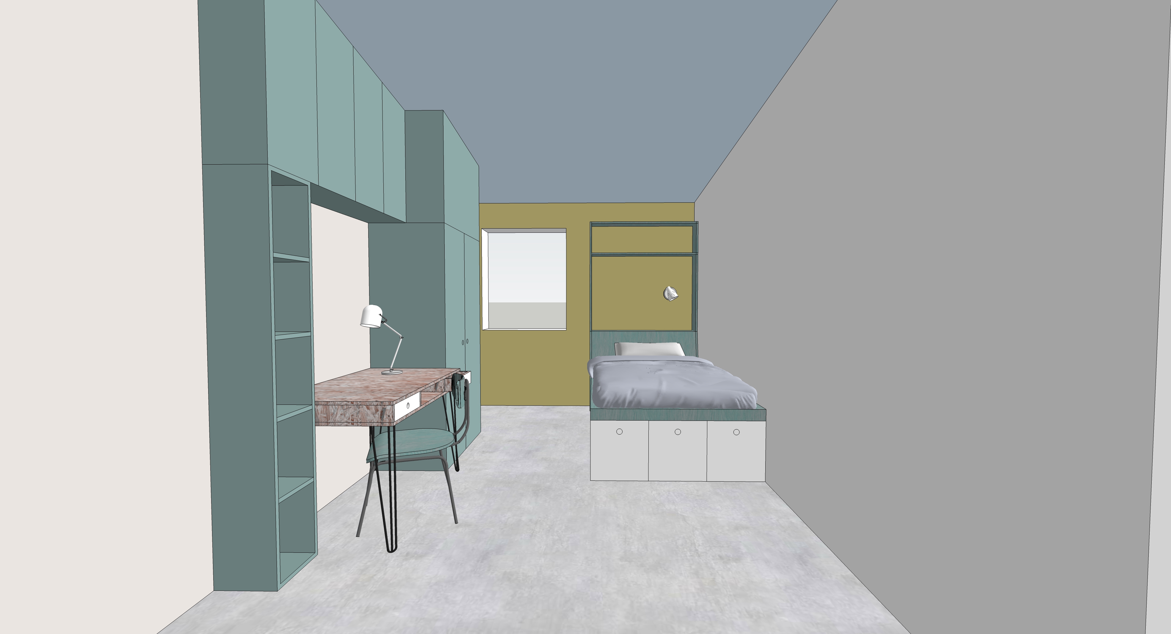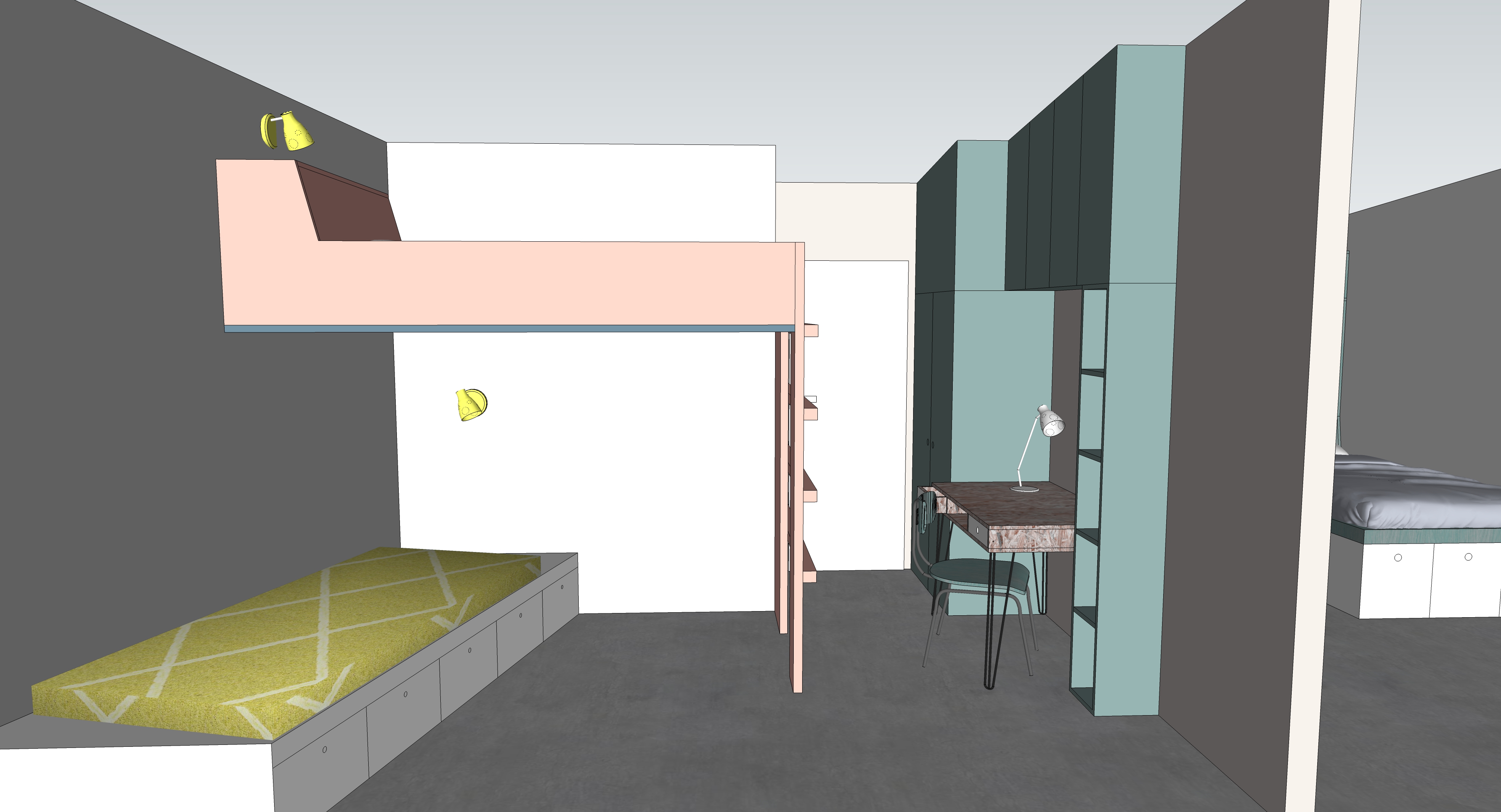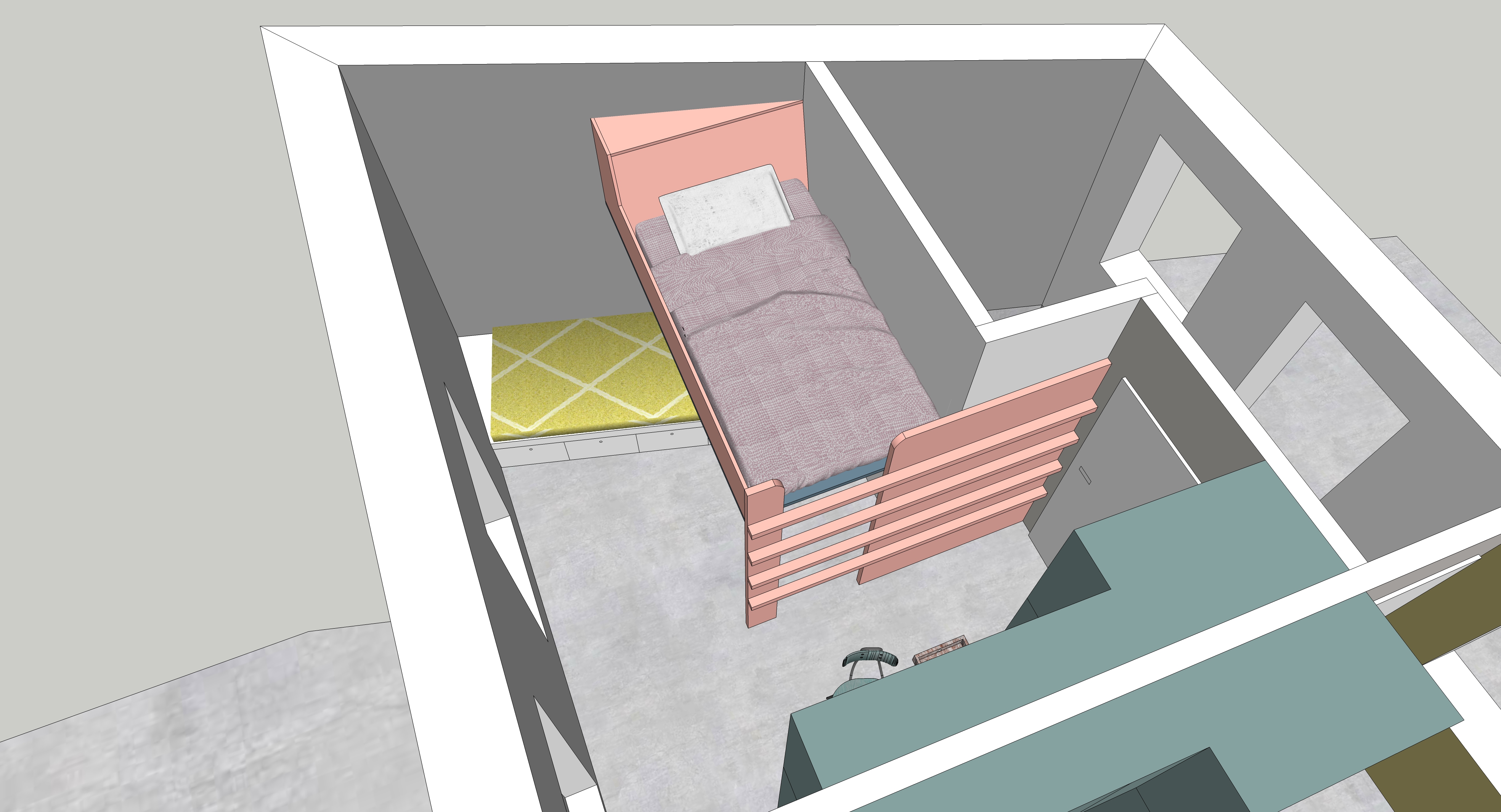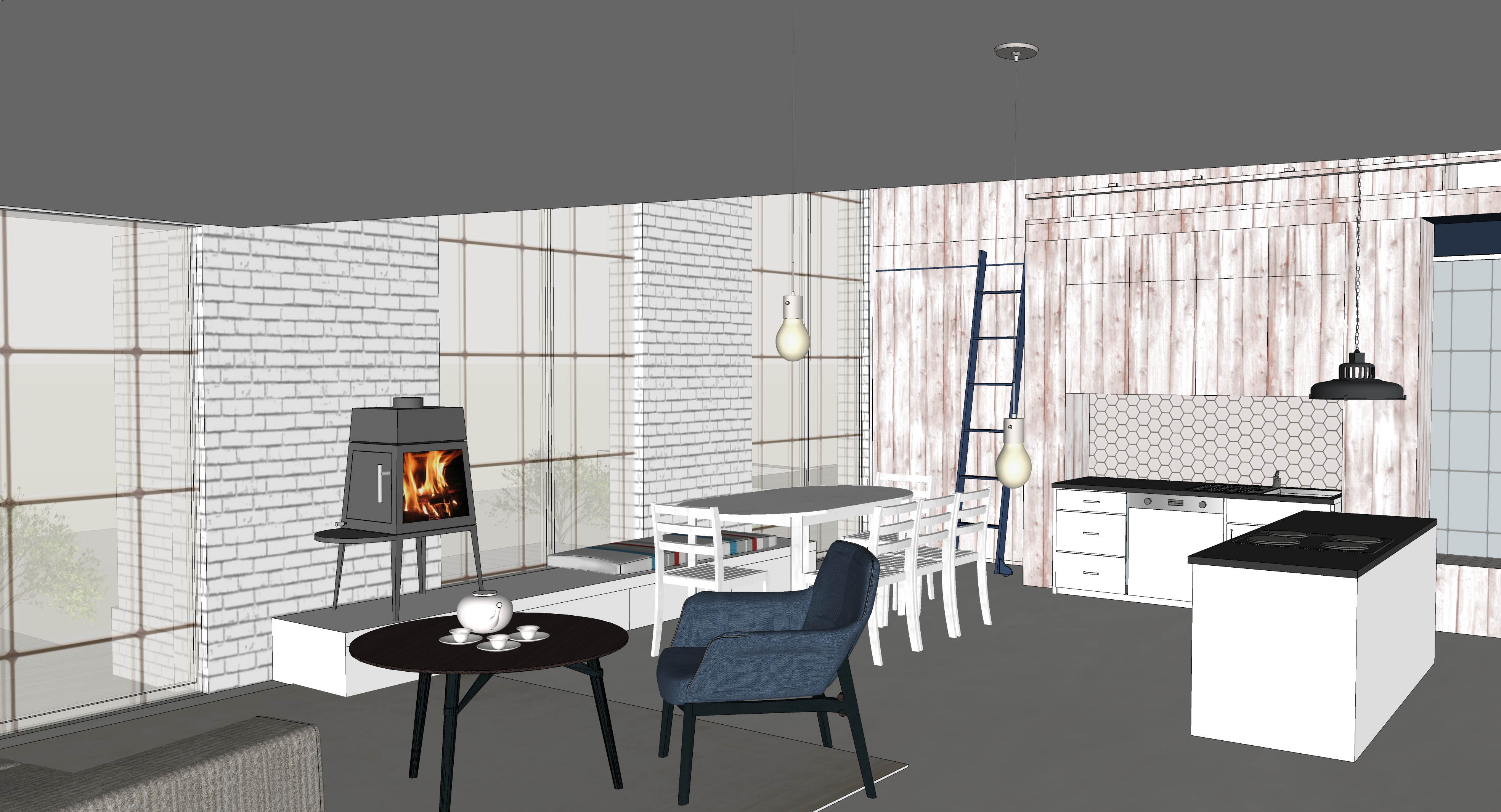 Der Bestand ist ein extrem verbauter 1-geschossiger einfacher Ziegelbau, dessen Grundsubstanz erst einmal freigeschält werden musste. Da die Grundfläche für die einzelnen Familien begrenzt ist, entschieden sich die Bauherren für einen gemeinsamen Zugang vom Hof über das vorhandene Souterrain. Dadurch konnten die Wohnräume zu großzügigen Lofts werden. Eine eingezogene Galerie-Ebene in die fast 5 Meter hohen Räume bietet genügend Raum für Elternschlafzimmer und Bad, eine Treppe führt von dort weiter hoch in das Sattelgeschoss auf dem Dach, wo die jeweils 2 Kinder wohnen.