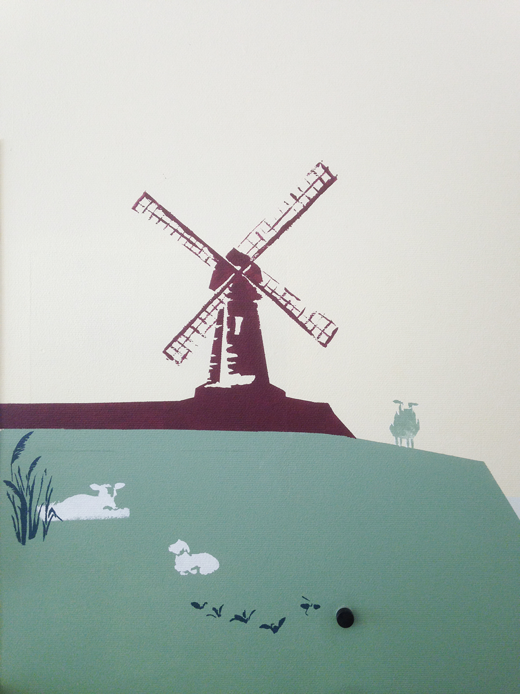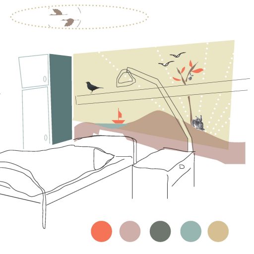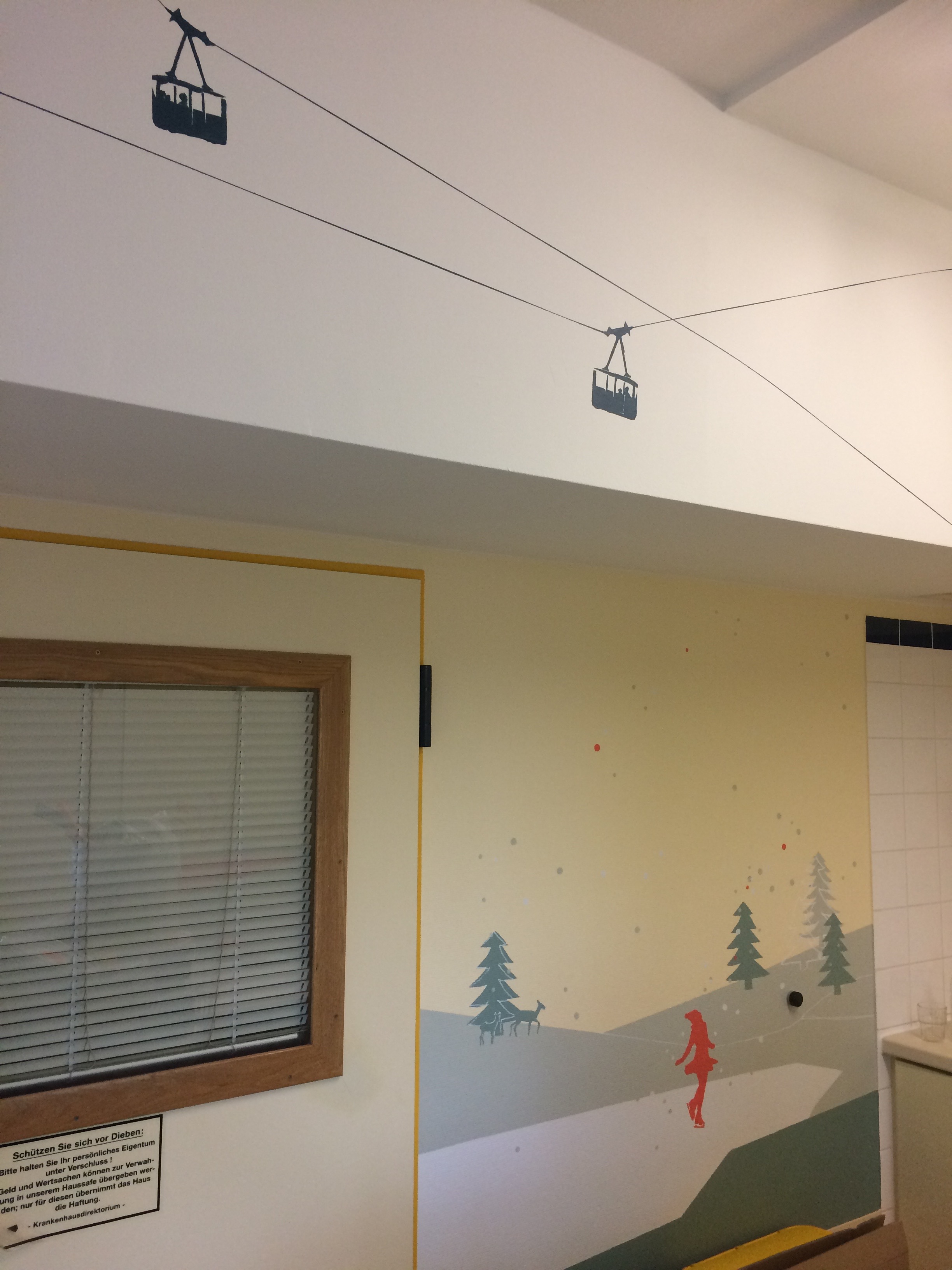 Also entwickelten wir vielfältige „Traumlandschaften“ durch eine Wandgrafik, welche die Enge der kleinen Krankenzimmer öffnet durch Weite, Horizonte, Landschaftliche Assoziationen, belebt durch Szenen mit Motiven von Kindern, Tieren und Pflanzen aus verschiedenen landschaftlichen Zonen.